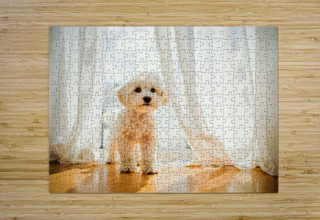 Poodle Puppy Peeking Behind Burgundy Curtains Puppy Prints Puzzle