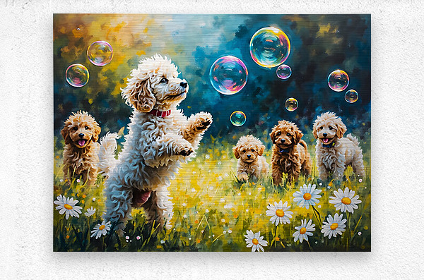 Get this artwork "Poodle Puppy Discovers Magical Floating Bubbles" in a framed print.