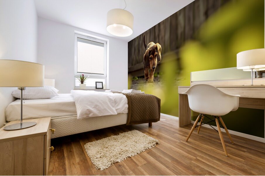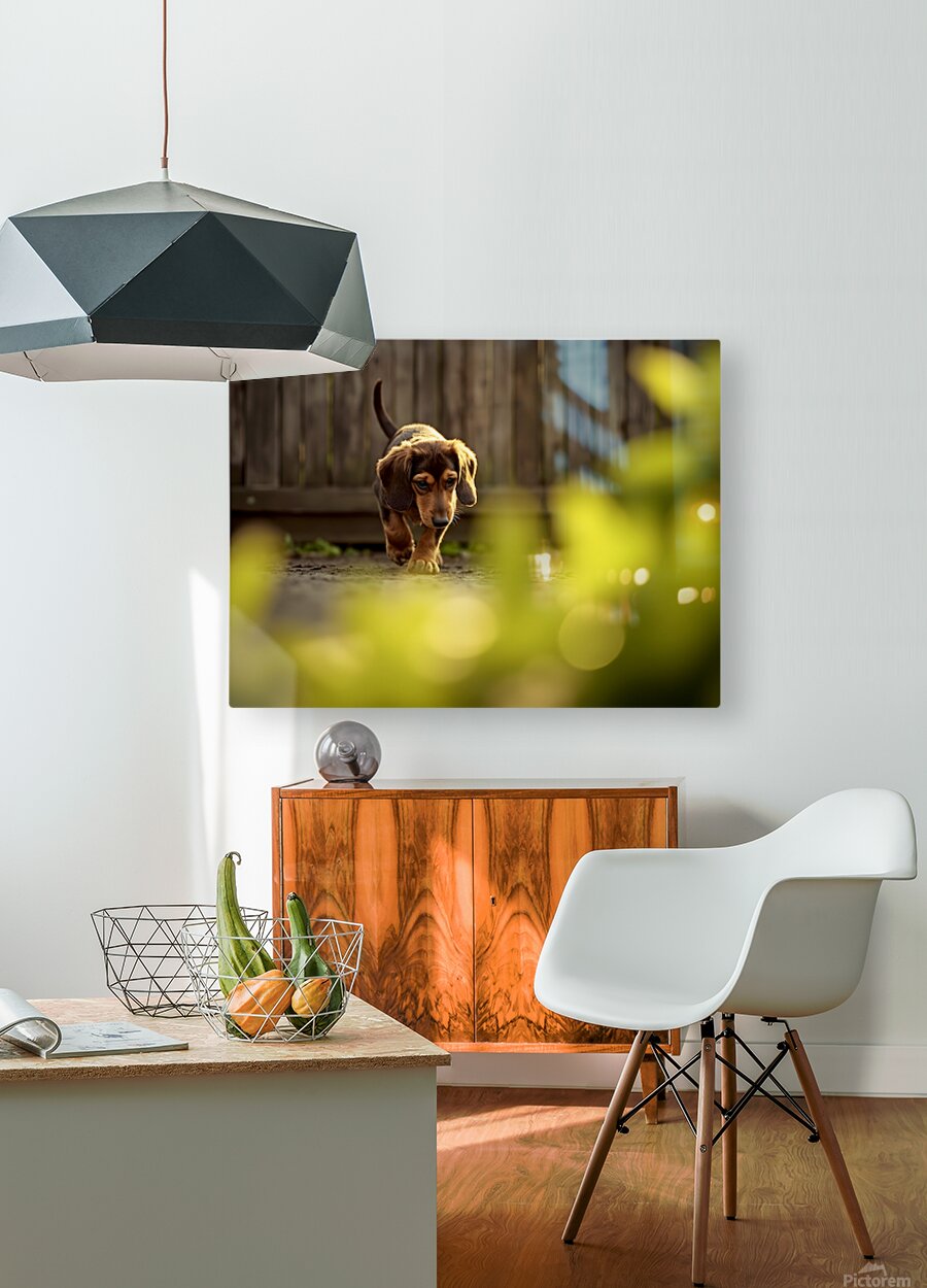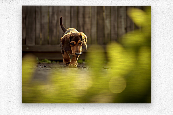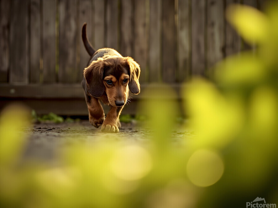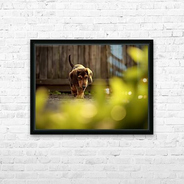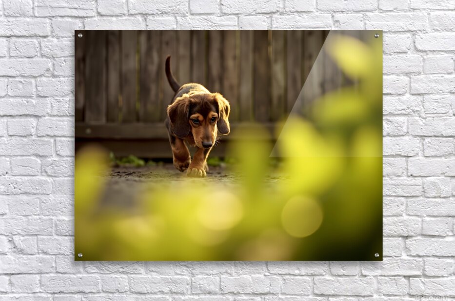 Get this artwork "Sleepy Dachshund Puppy Yawns In Garden" in a framed print.