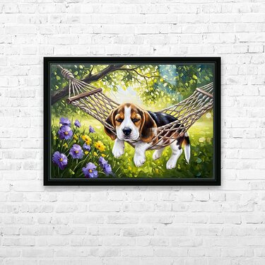 An adorable beagle puppy with distinctive brown white and black coat markings rests peacefully in a tiny woven hammock suspended between wooden posts surrounded by a beautiful garden setting with soft morning light Digital Artwork.