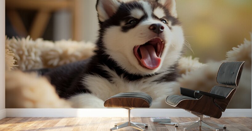 A small Siberian Husky puppy with distinctive black and white markings and bright blue eyes rests peacefully in a comfortable cream-colored dog bed curled up in a tight ball with fluffy fur Digital Artwork.