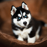 A peaceful Siberian Husky puppy with black and white fur lies contentedly on his side in a soft bed with sleepy blue eyes and one small paw draped over the cushion edge Digital Artwork.