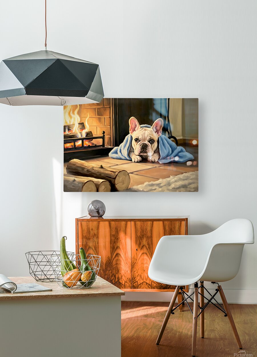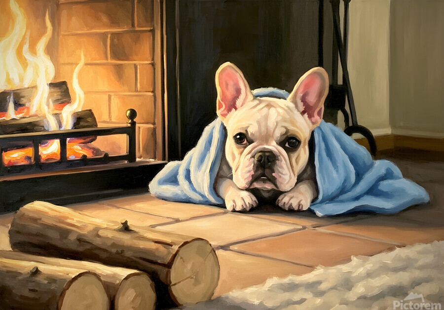 ABOUT THIS ARTWORK: FRENCH BULLDOG PUPPY HAPPY AND WARM AFTER BEACH ADVENTURE