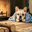 The cream and fawn French Bulldog puppy is now completely dry and playful no longer needing the towel. The happy pup plays with a soft toy on warm carpet in bright sunlight streaming through a window. Digital Artwork.
