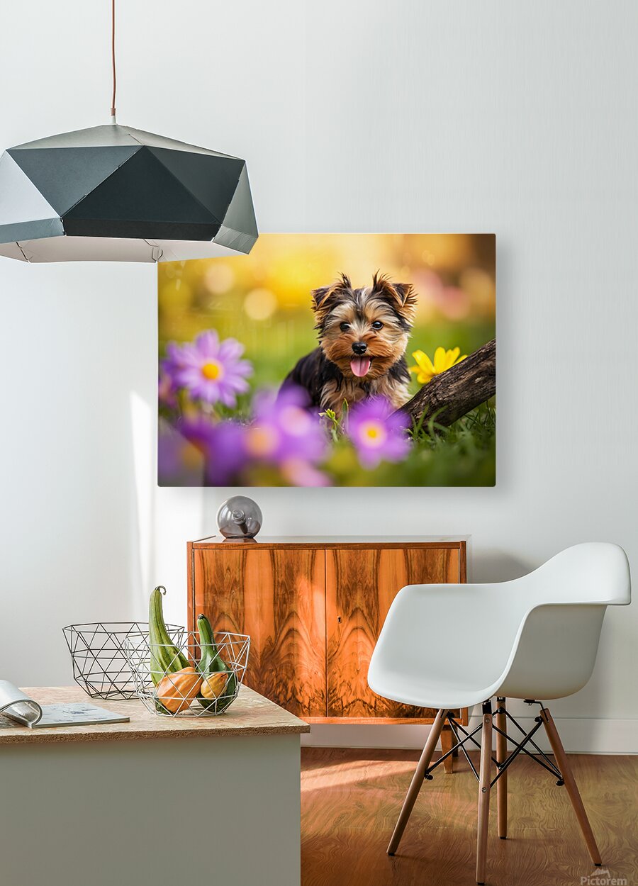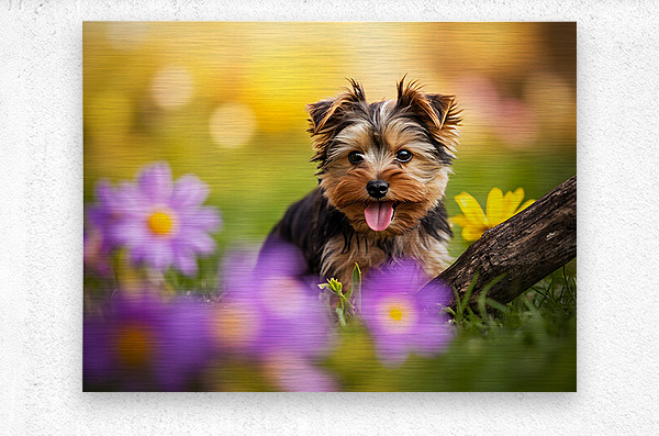 A small Yorkshire Terrier puppy with tan and black silky coat attempts to drag an enormous brown stick across green grass in a bright garden setting with blurred flowers creating a dreamy foreground Digital Artwork.