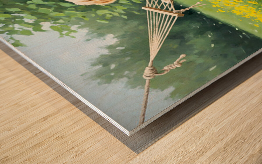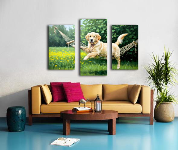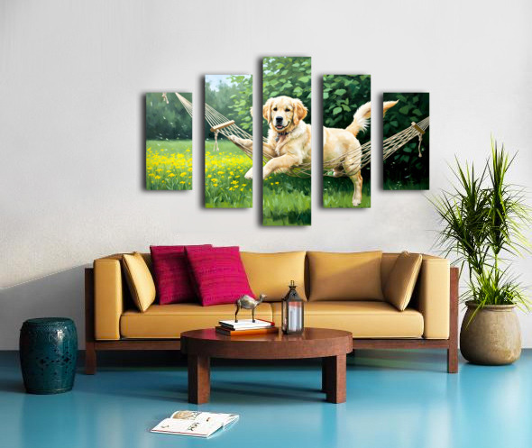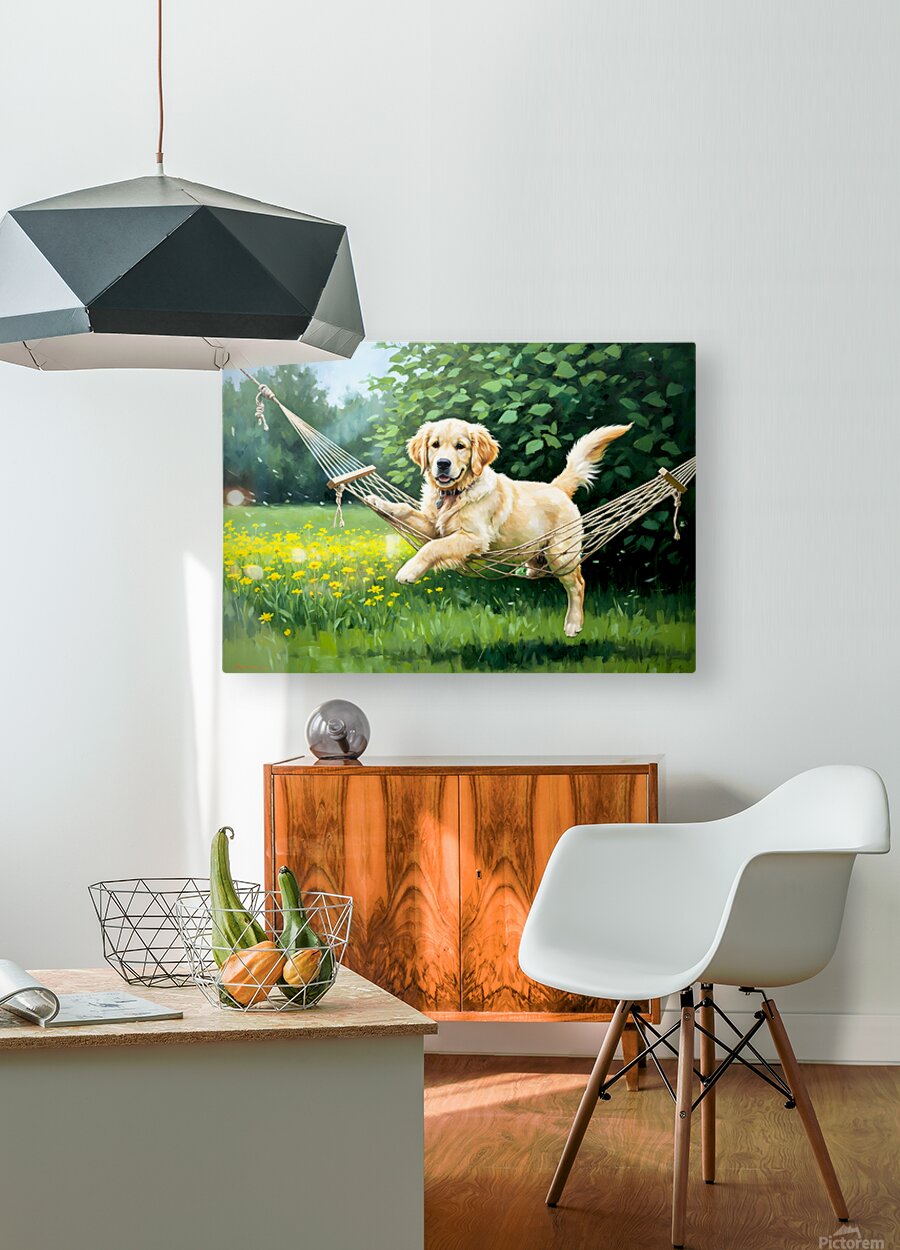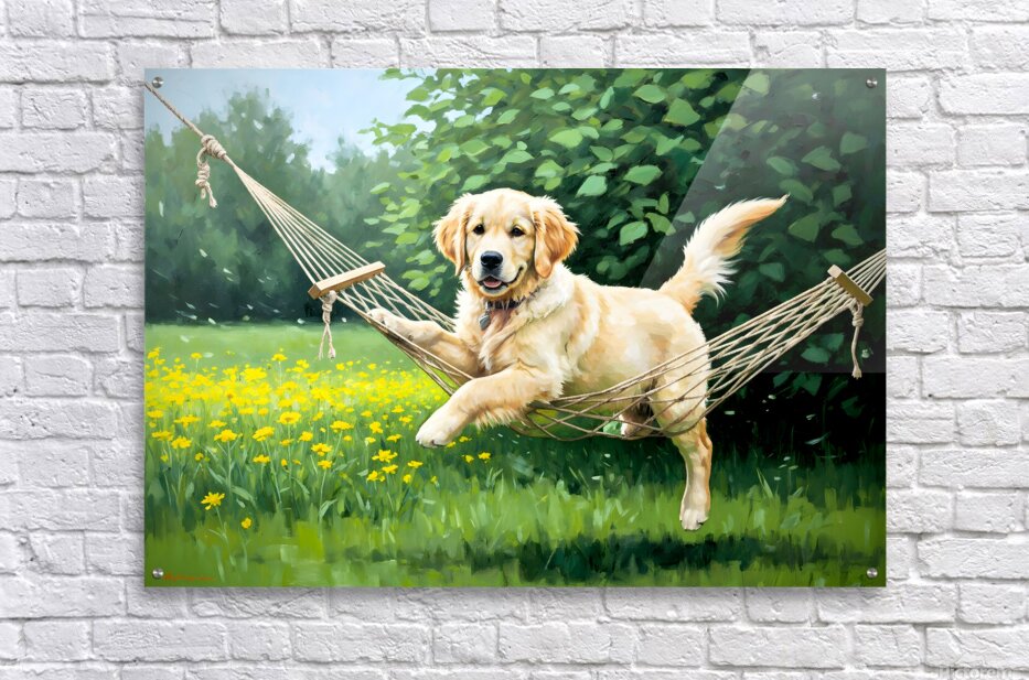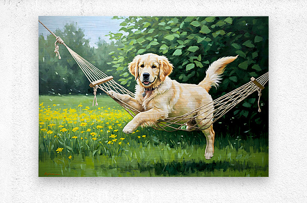 ABOUT THIS ARTWORK: GOLDEN RETRIEVER PUPPY DISCOVERS TINY HAMMOCK IN GARDEN