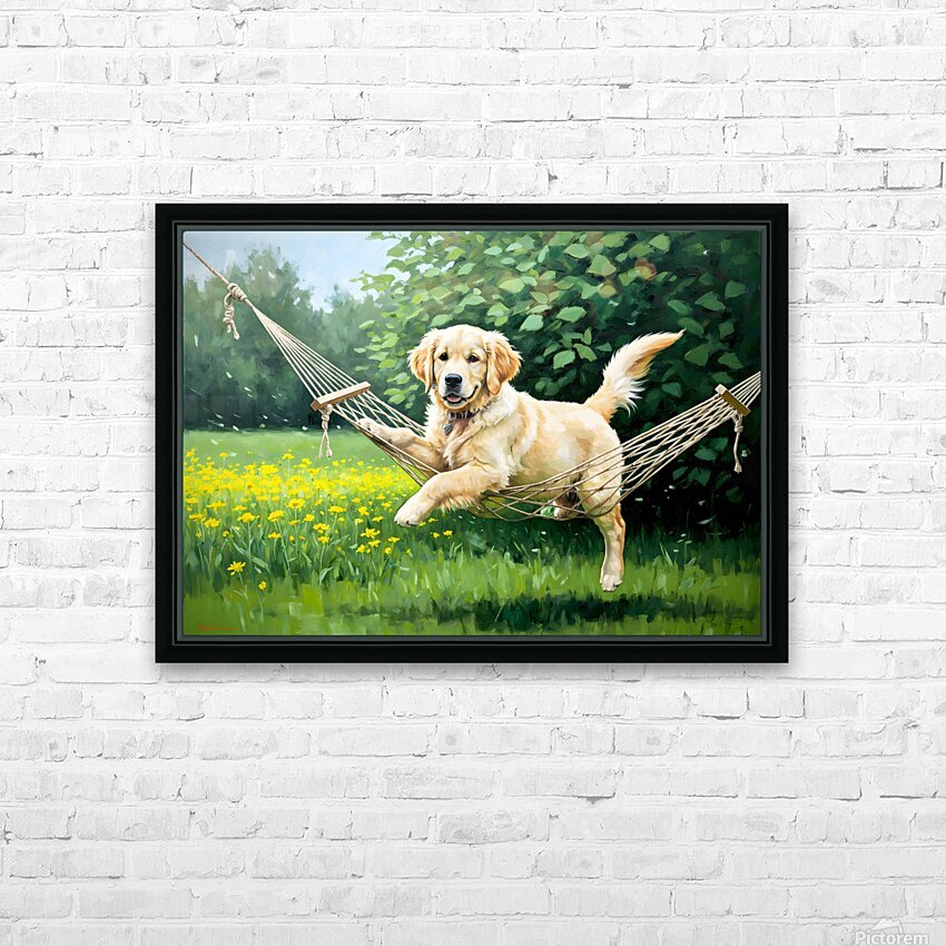 Get this artwork "Golden Retriever Puppy Discovers Tiny Hammock In Garden" in a framed print.