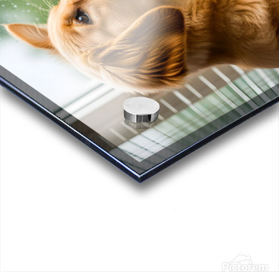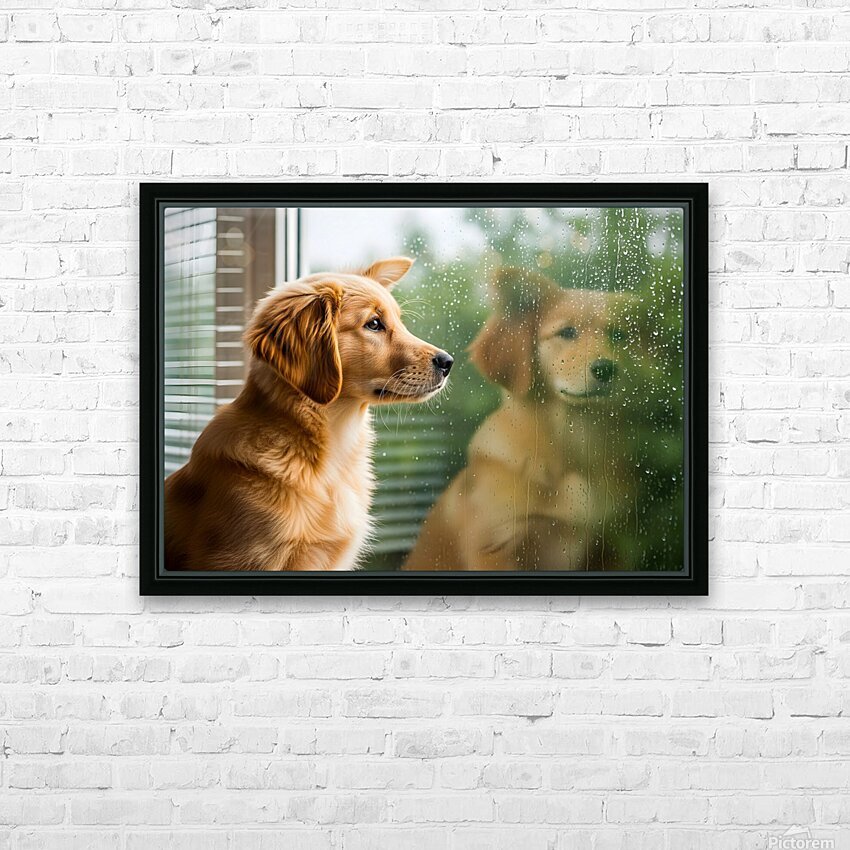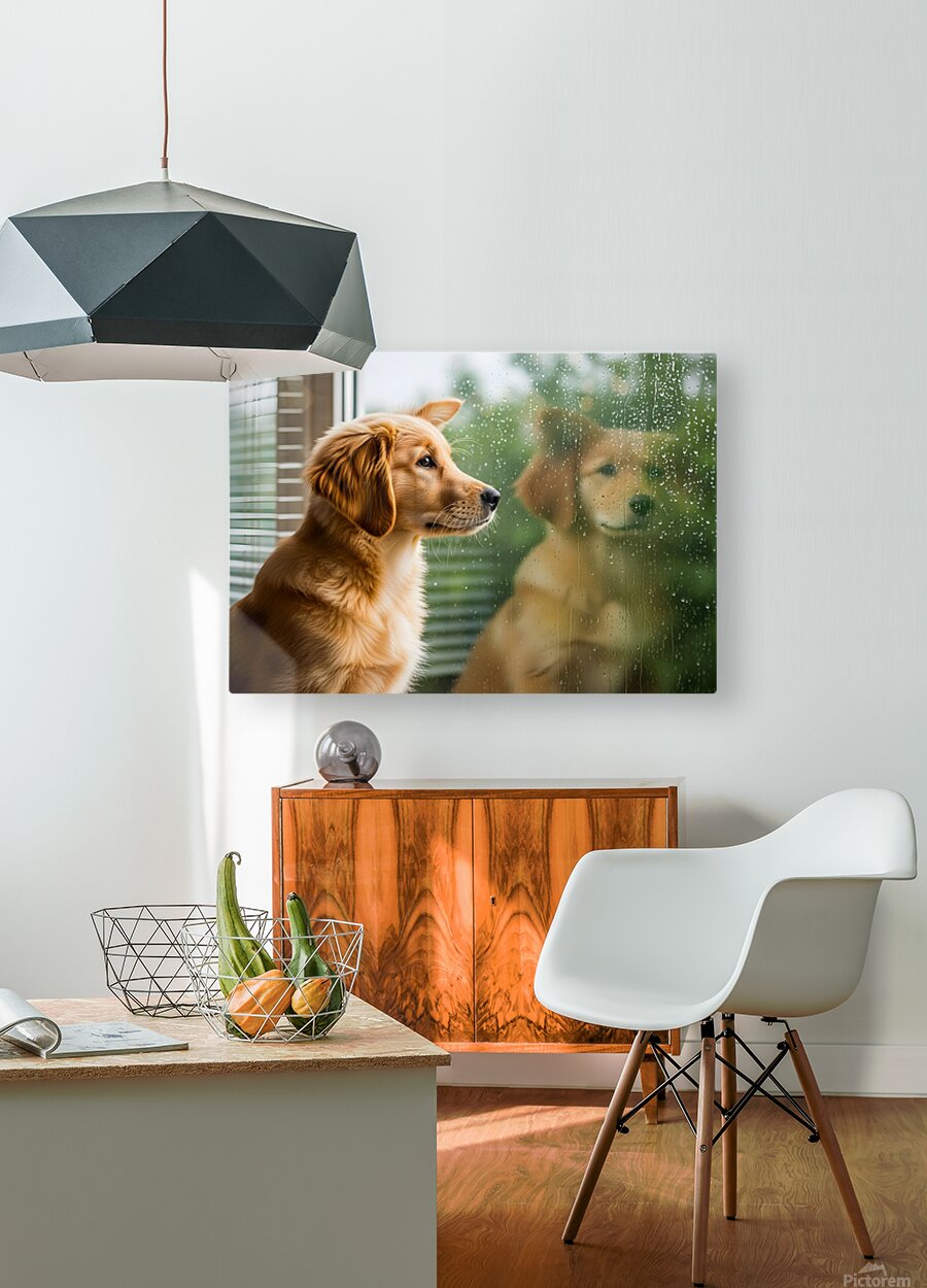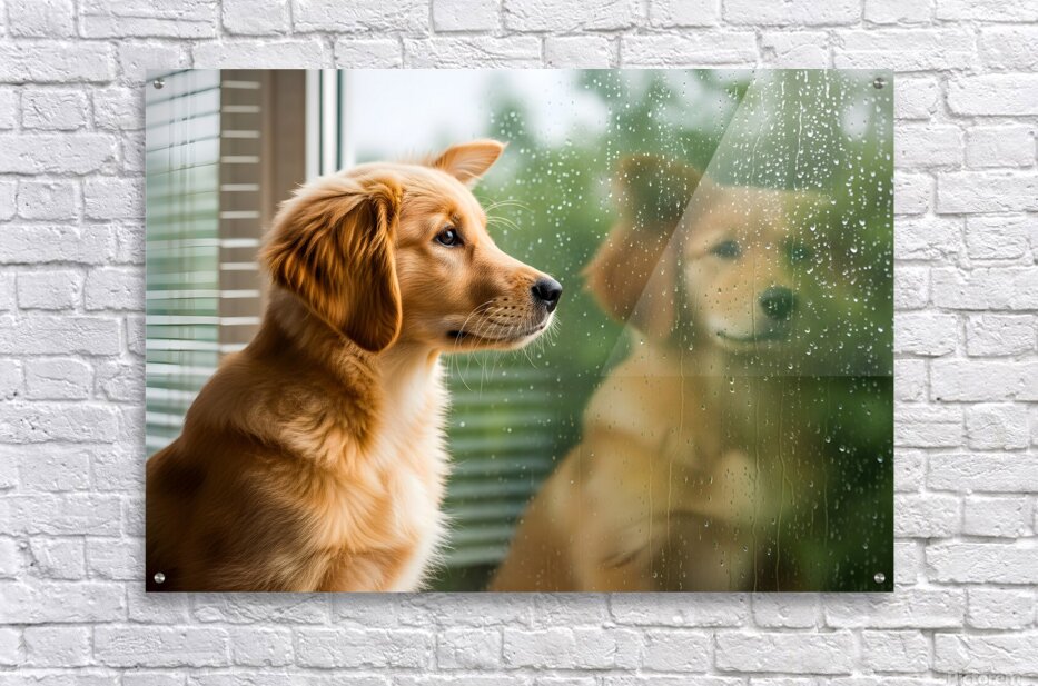 ABOUT THIS ARTWORK: PEACEFUL GOLDEN RETRIEVER PUPPY RESTS BY RAINY WINDOW