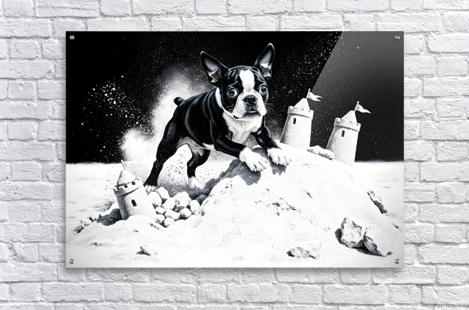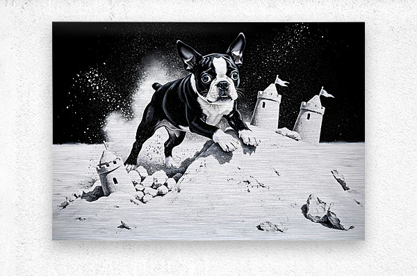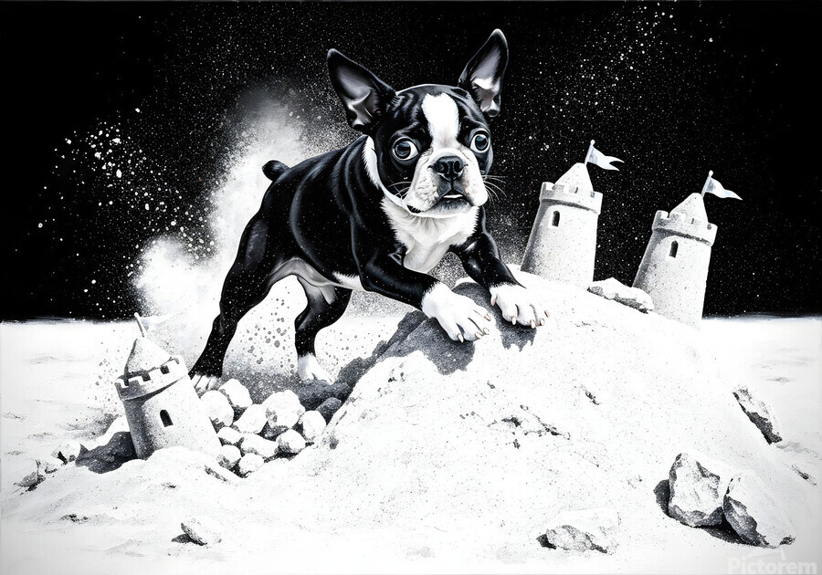 A cheerful black and white Boston Terrier puppy sits contentedly among the sandy remains of a demolished castle completely covered in sand but with a big smile. Despite the destruction the puppys tail wags happily in the beach setting. Digital Artwork.