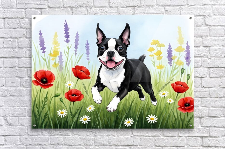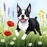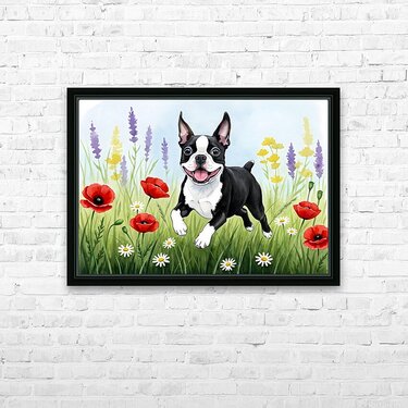 Get this artwork "Boston Terrier Puppy Discovers Wildflower Meadow" in a framed print.