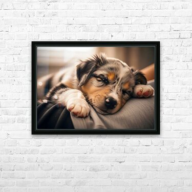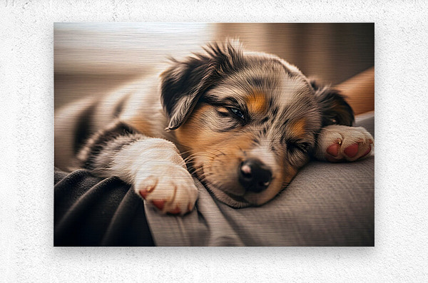 The blue merle Australian Shepherd puppy sits upright on someones chest now fully awake with bright blue eyes sparkling. The puppys tail wags enthusiastically showing readiness for the day ahead. Digital Artwork.