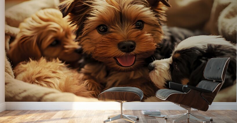 A tiny Yorkshire Terrier puppy with distinctive brown and tan silky coat sits among several other adorable puppies of different breeds and colors in a wicker laundry basket lined with fluffy white towels and soft blankets Digital Artwork.