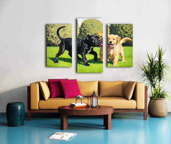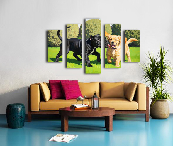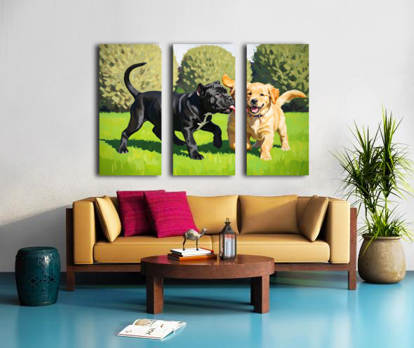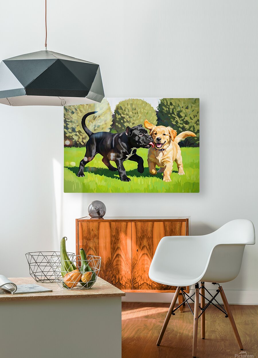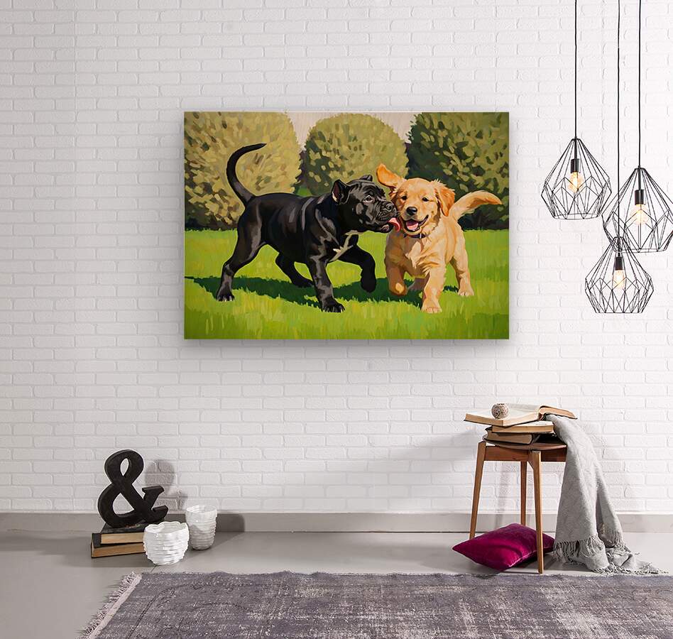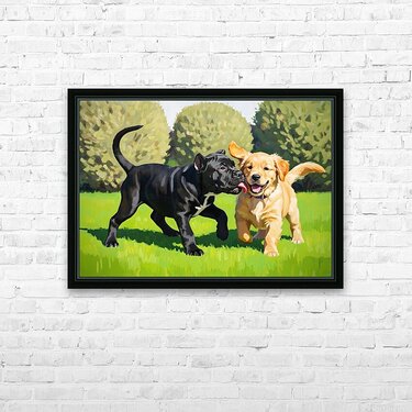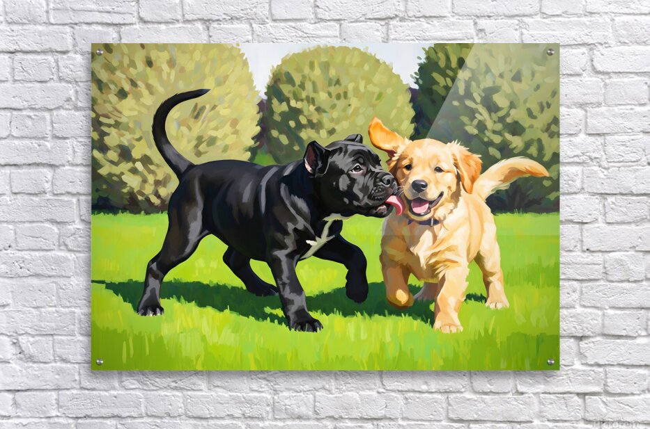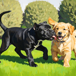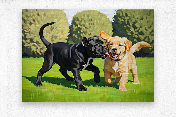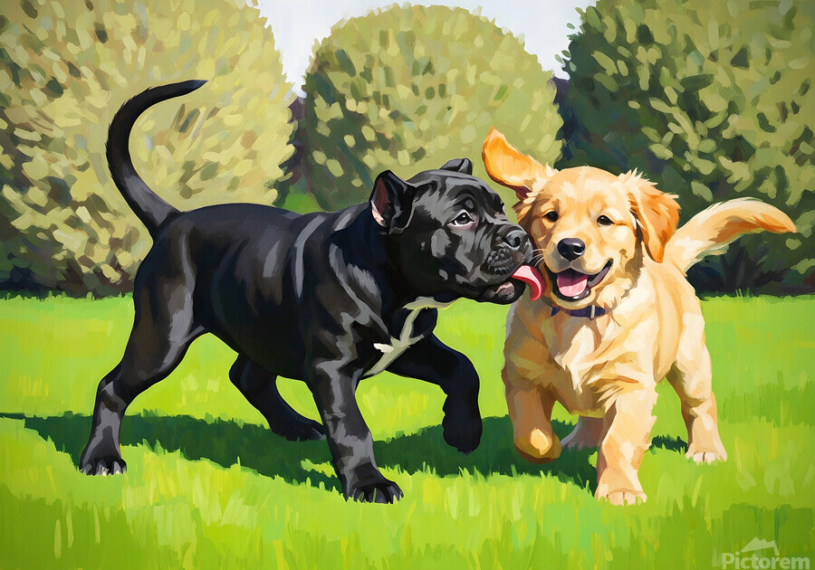 After their playful adventure the sleepy black Cane Corso puppy gives gentle farewell licks to the golden retriever puppy. Both tired puppies rest on soft grass in beautiful late afternoon golden light in the peaceful garden. Digital Artwork.