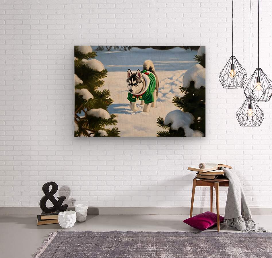 Adorable gray and white Siberian Husky puppy wearing festive red holiday outfit with white fluffy trim sitting among wrapped presents on wooden floor with cozy indoor lighting Digital Artwork.