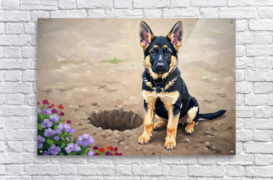 ABOUT THIS ARTWORK: PROUD GERMAN SHEPHERD PUPPY SHOWS OFF DIGGING ACHIEVEMENT