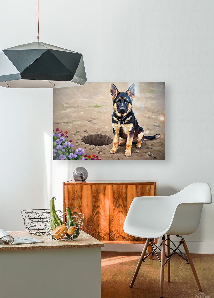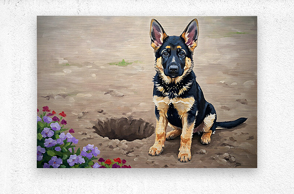 ABOUT THIS ARTWORK: PROUD GERMAN SHEPHERD PUPPY SHOWS OFF DIGGING ACHIEVEMENT