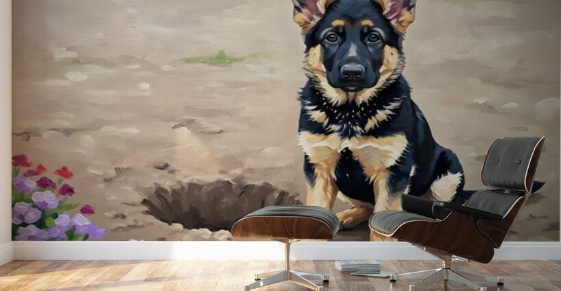 A German Shepherd puppy with black and tan fur stands proudly beside a deep hole in the garden soil. The confident pup displays perfect posture with chest out and head high showing off the impressive digging accomplishment while flowers blur beautifully around. Digital Artwork.
