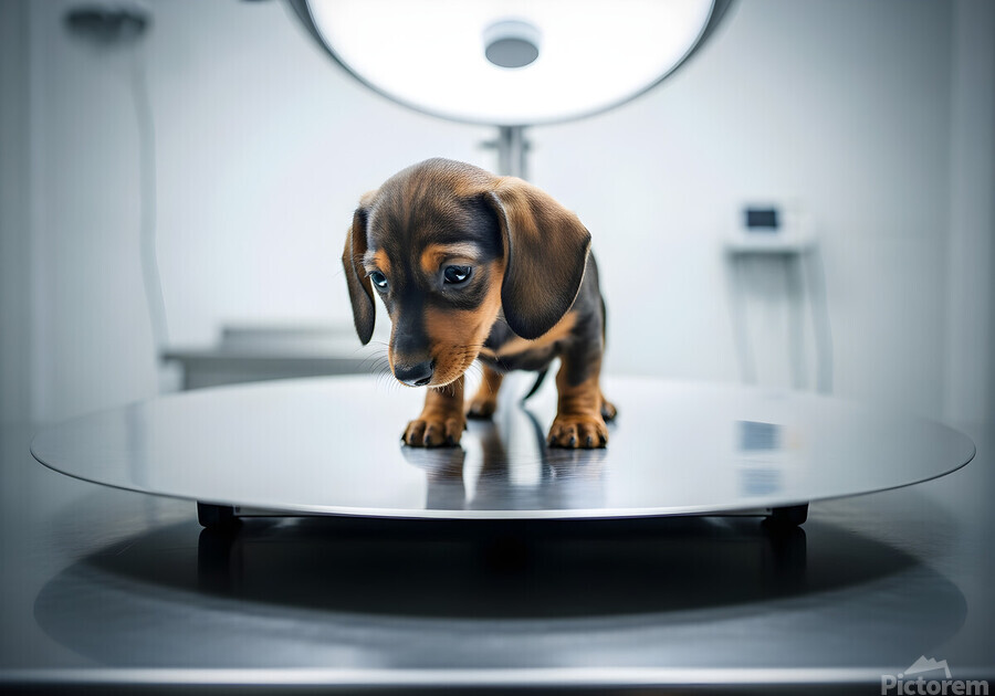 The brown and black dachshund puppy sits more relaxed after completing the weighing process with a gentle tail wag and calmer expression. The puppy appears relieved and more confident having successfully completed the veterinary procedure. Digital Artwork.