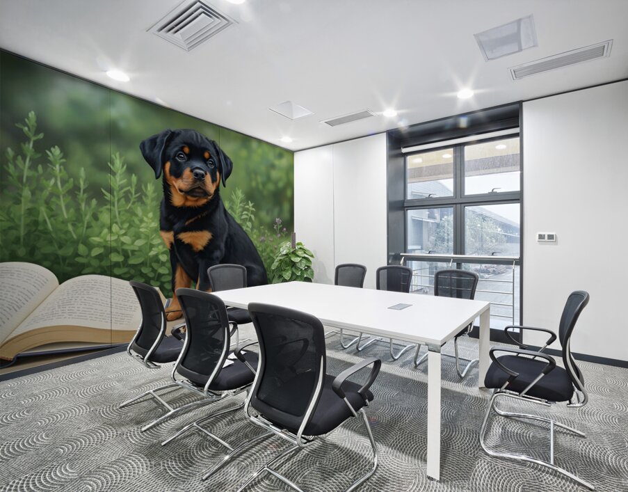 A black and tan Rottweiler puppy leans forward with determination toward an open book displaying focused attention and eagerness to continue reading the story on cream-colored pages. Digital Artwork.