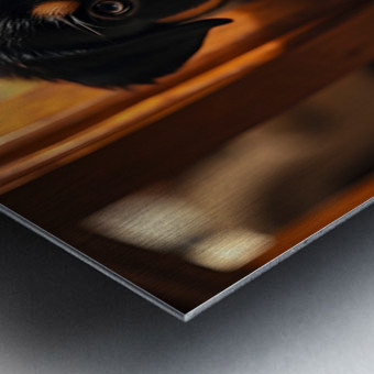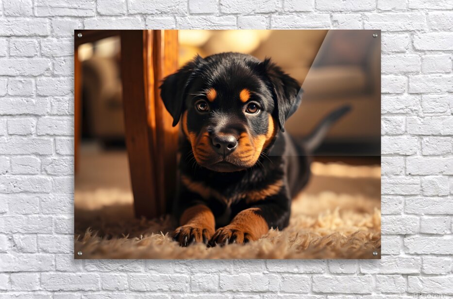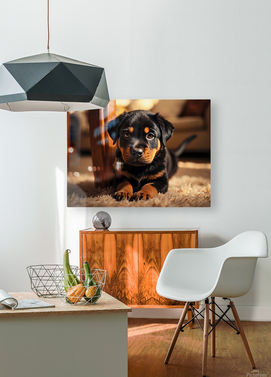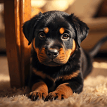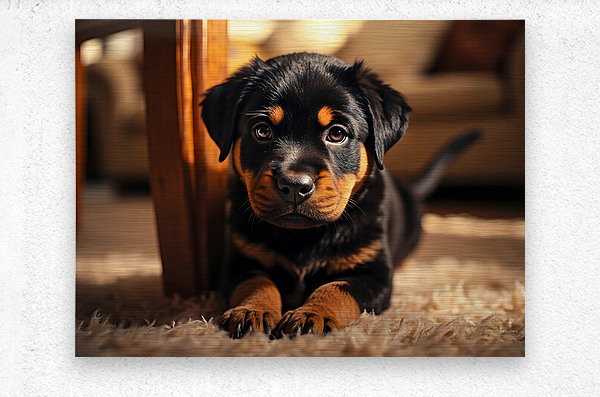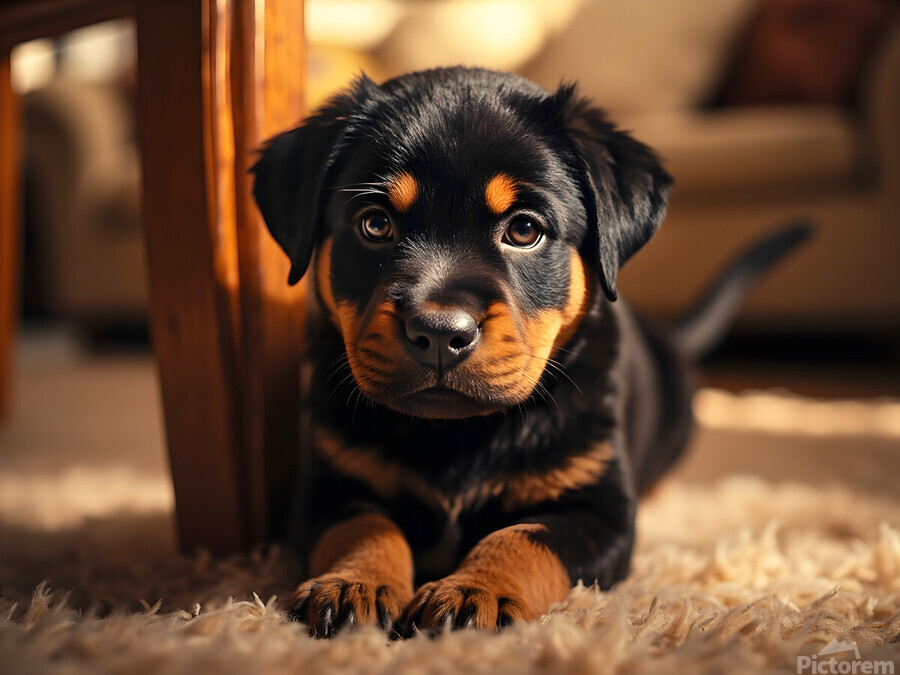 A delighted black and tan Rottweiler puppy lies comfortably beside a table base carefully holding a bright game piece in its mouth with a satisfied expression tail wagging happily as it becomes part of the family activity Digital Artwork.