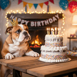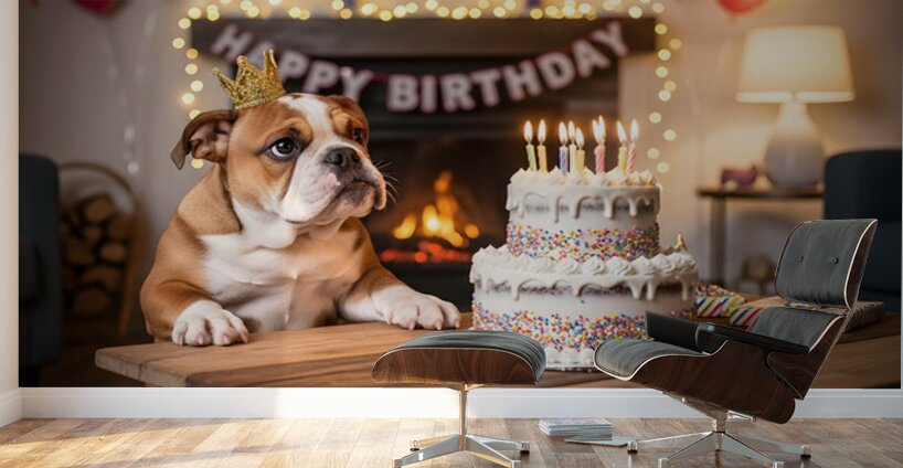 An adorable brown and white bulldog puppy sits proudly wearing an oversized golden crown at a festive birthday celebration. Colorful balloons and wrapped gifts create a joyful party atmosphere in the background. Digital Artwork.