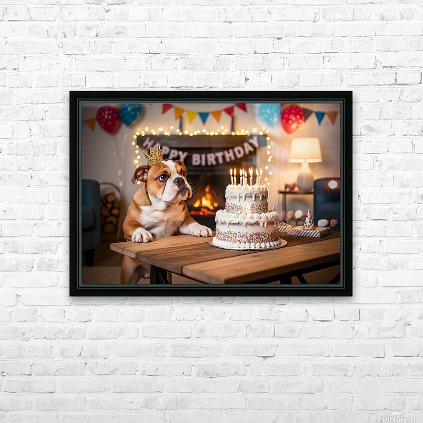Bulldog Puppy With Golden Crown At Birthday Party Picture Frame Printing