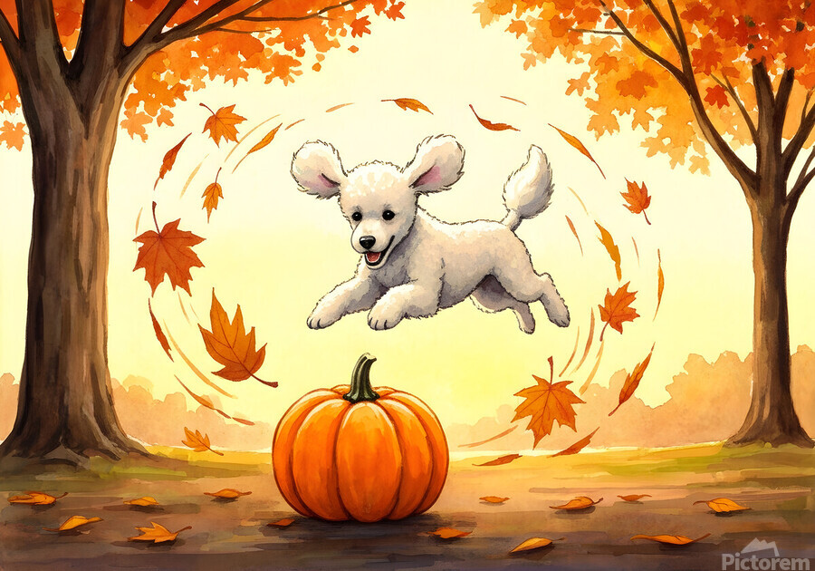 The white poodle puppy sits peacefully beside several small pumpkins looking content and slightly tired after exploring with soft golden sunlight warming its fluffy curls. Digital Artwork.