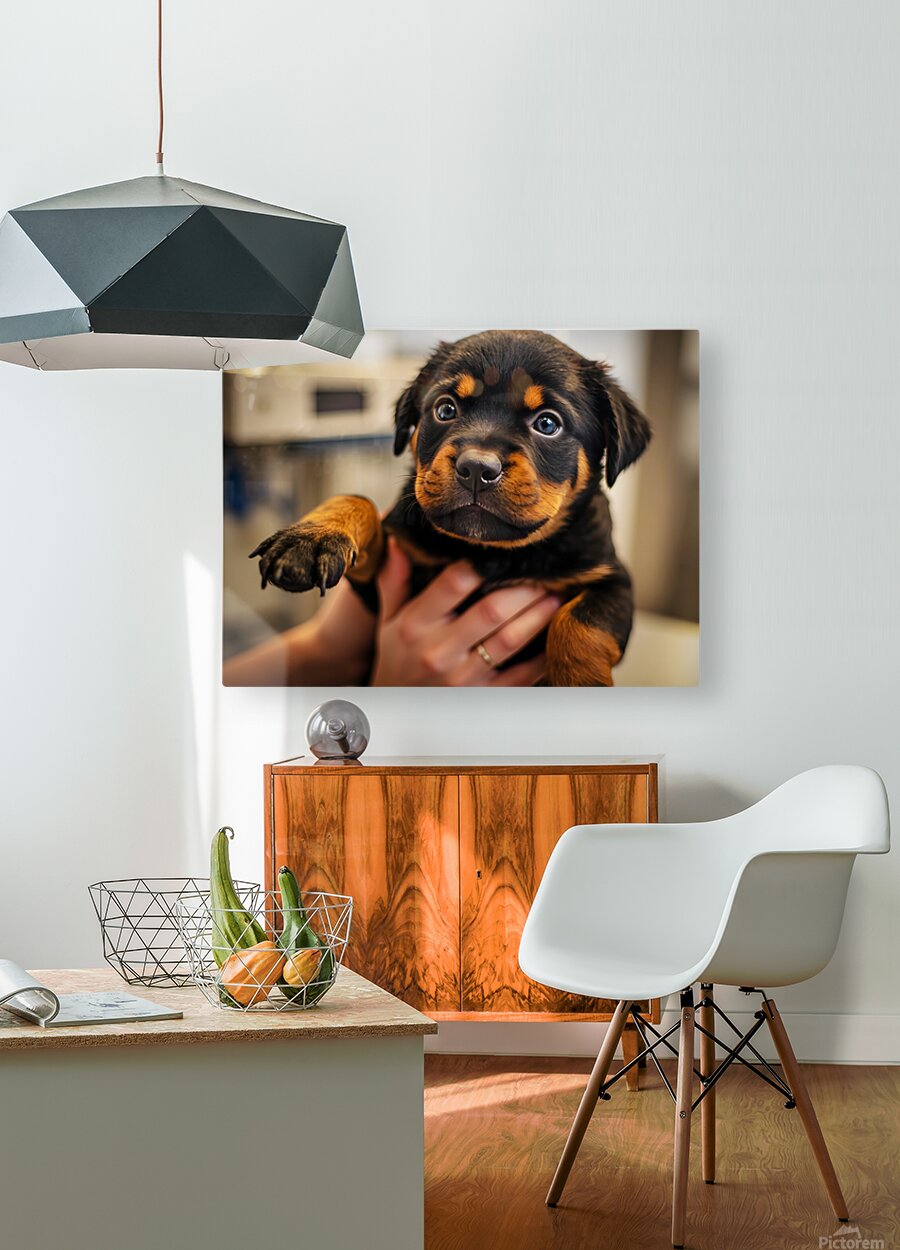 A young black and tan Rottweiler puppy sits anxiously in a clean veterinary examination room. The puppys dark coat with tan markings gleams under the soft lighting as it gazes upward with large uncertain eyes. Digital Artwork.