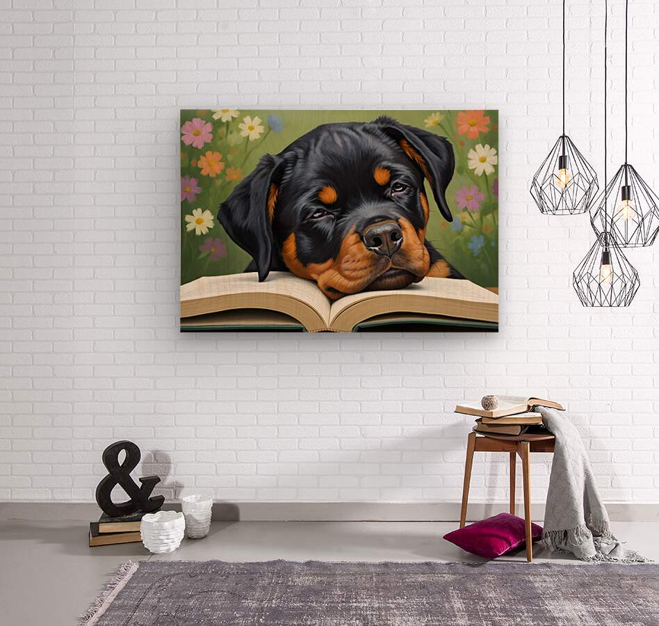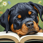 Get this artwork "Sleepy Rottweiler Puppy Dreams Over Open Book" in a framed print.
