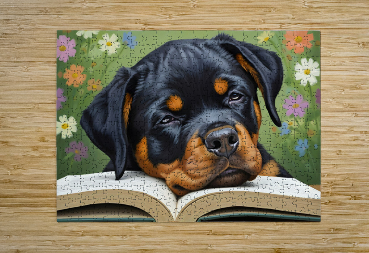 Sleepy Rottweiler Puppy Dreams Over Open Book Puppy Prints Puzzle printing