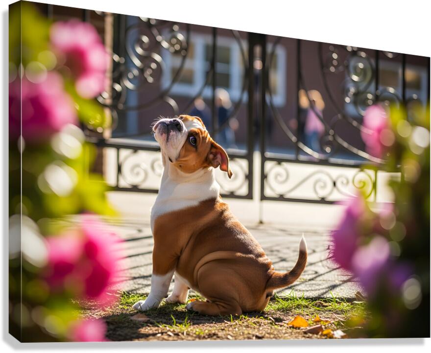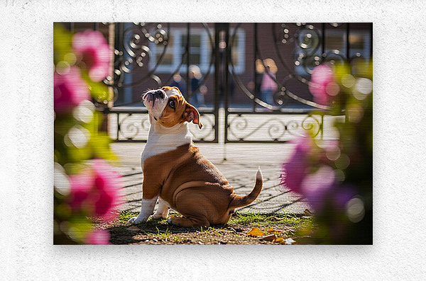 Get this artwork "Bulldog Puppy Waits By School Gate" in a framed print.