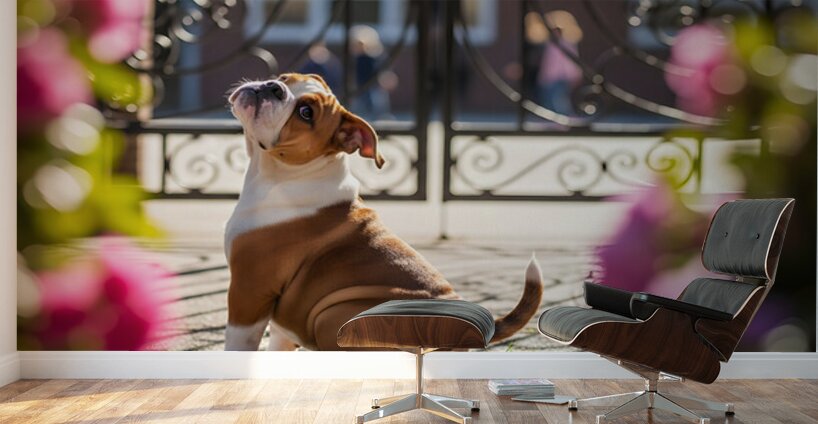BULLDOG PUPPY WAITS BY SCHOOL GATE