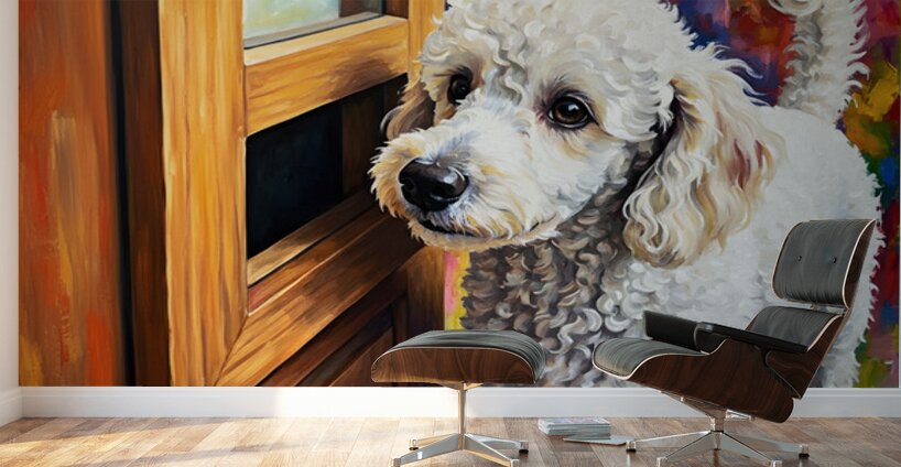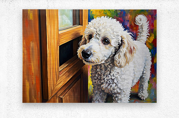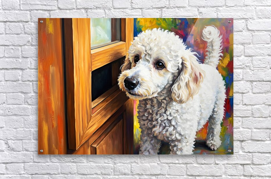 A curious white poodle puppy with fluffy curly fur stands against a wooden door looking through the mail slot with bright eager eyes as sunlight filters through the opening Digital Artwork.