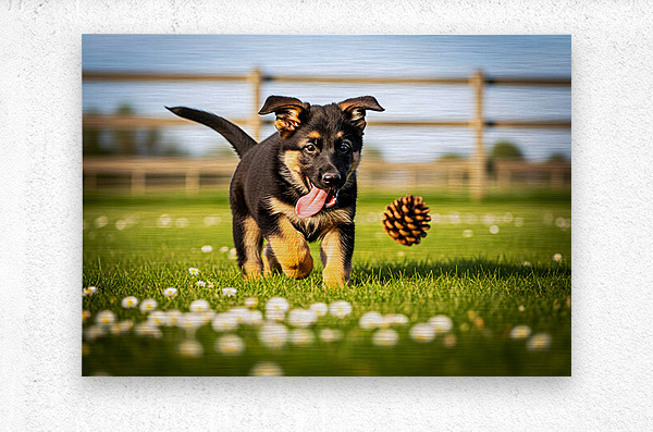 Get this artwork "German Shepherd Puppy Watches Pinecone Soar Through Air" in a framed print.