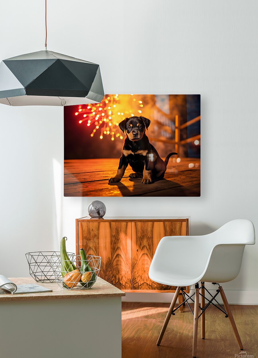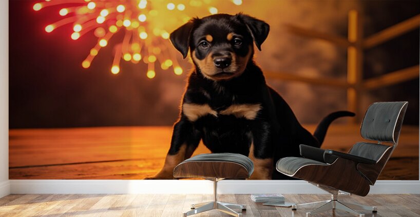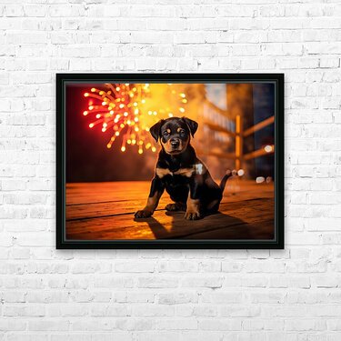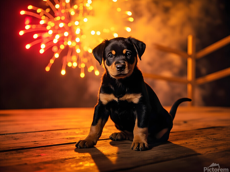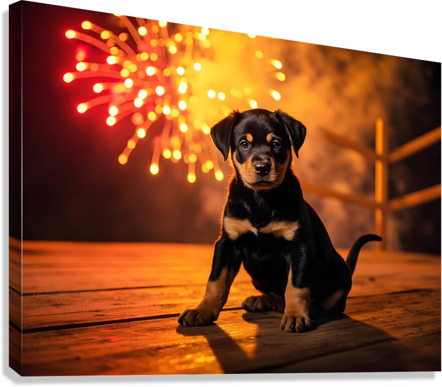 Get this artwork "Rottweiler Puppy Watches First Fireworks Display" in a framed print.