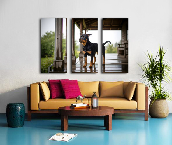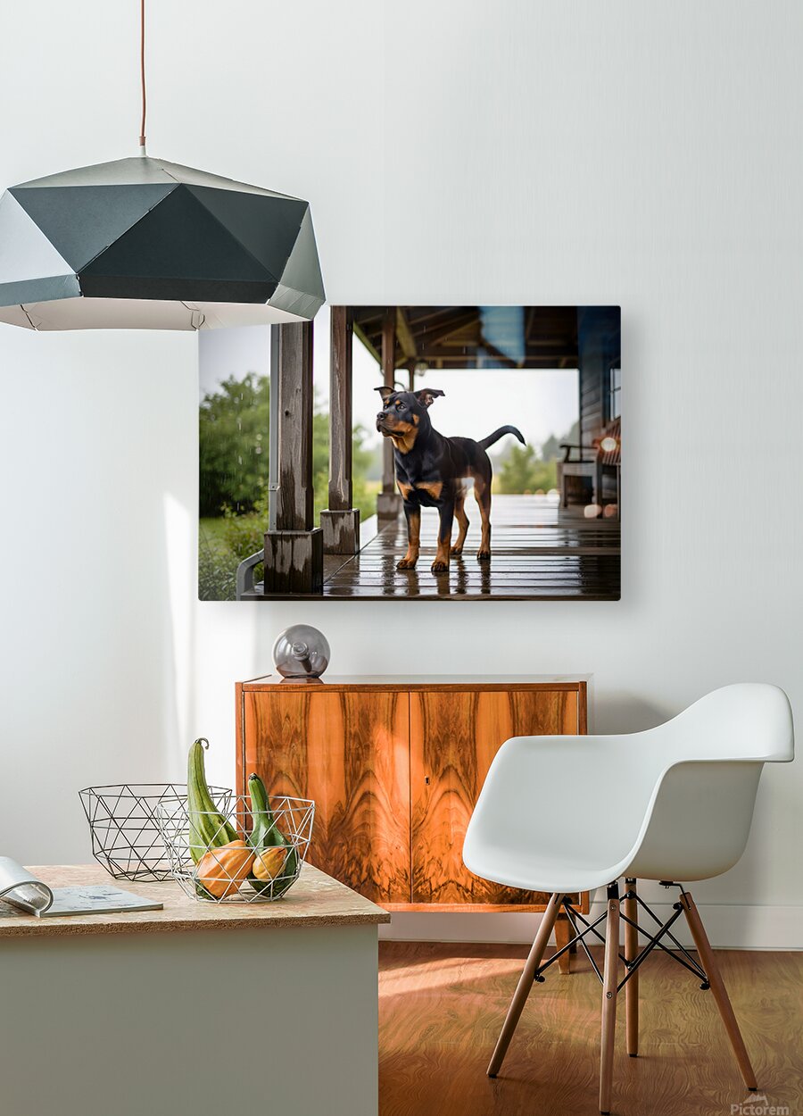 Get this artwork "Joyful Rottweiler Puppy Wags Tail Under Porch" in a framed print.