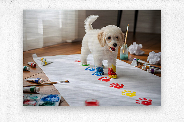 Get this artwork "Proud Poodle Puppy With Finished Paw Print Masterpiece" in a framed print.