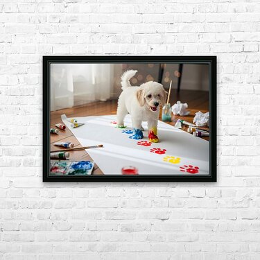A content white poodle puppy sits beside a completed paw print artwork featuring colorful blue red yellow and green prints in an abstract pattern. The...[+]