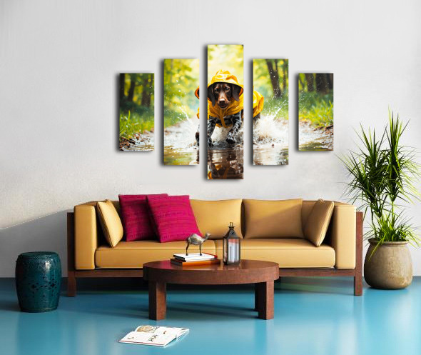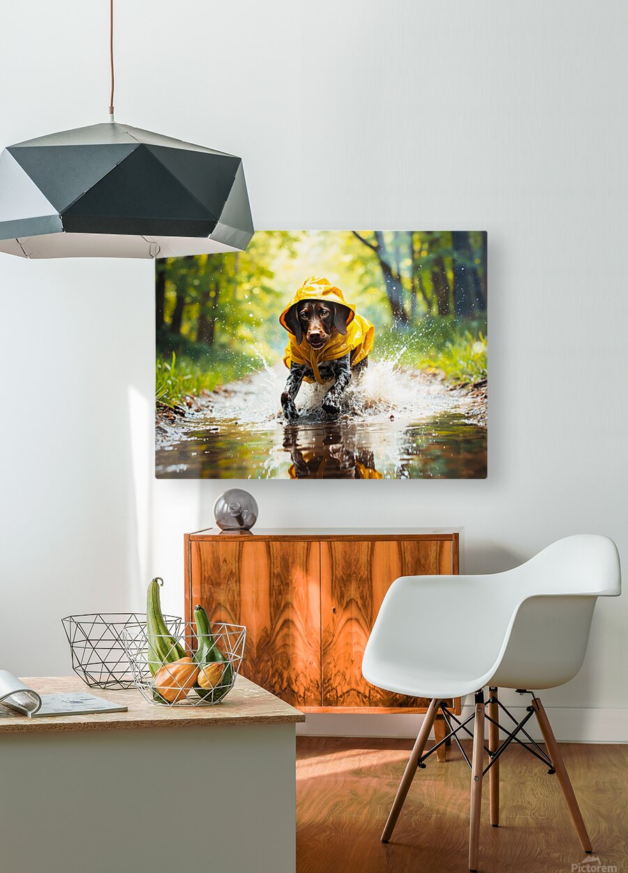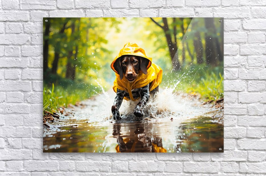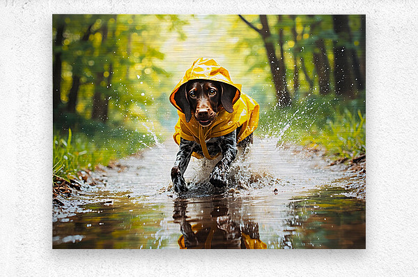 A cheerful German Shorthaired Pointer puppy with distinctive brown and white markings wears a vibrant yellow rain poncho while standing on a wet pavement surrounded by puddles and falling raindrops Digital Artwork.