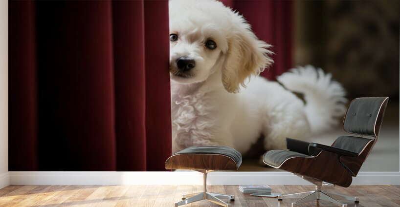 A small white poodle puppy attempts to hide behind a rich burgundy velvet curtain in a cozy living room. Only the puppys fluffy white tail peeks out from beneath the heavy fabric giving away the hiding spot. Digital Artwork.