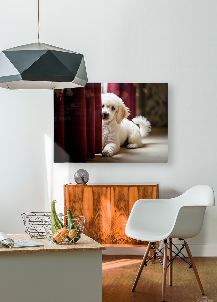Get this artwork "Poodle Puppy Plays Hide And Seek Behind Curtain" in a framed print.