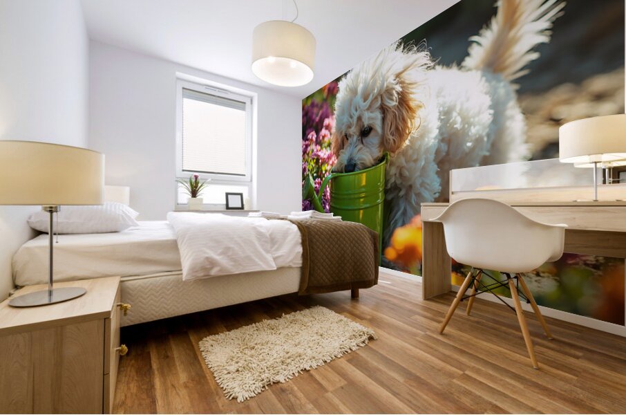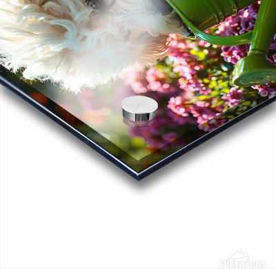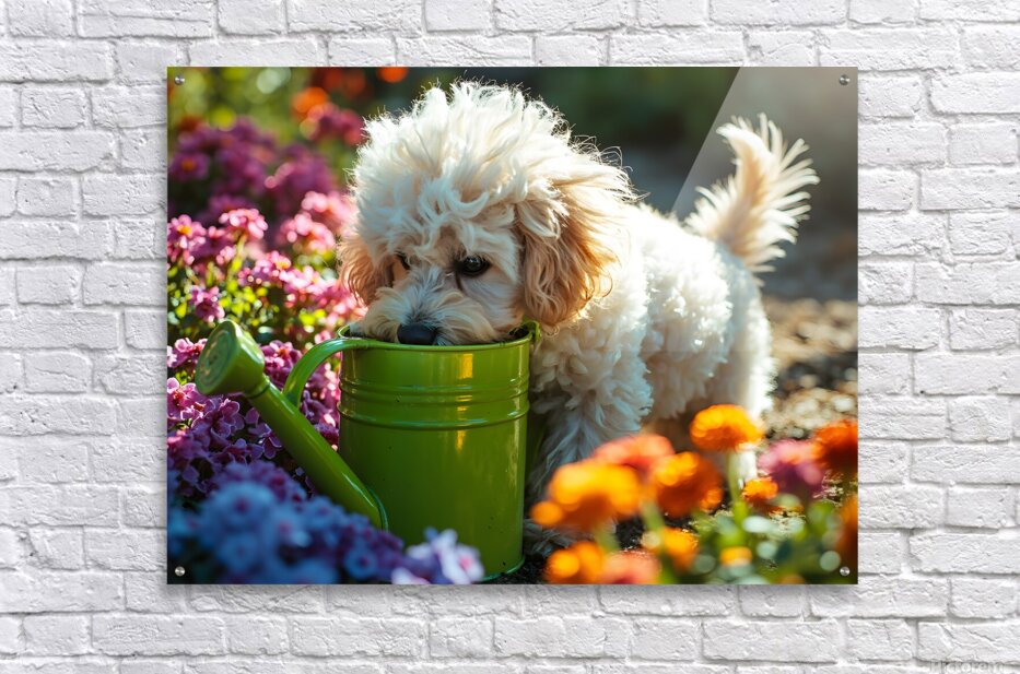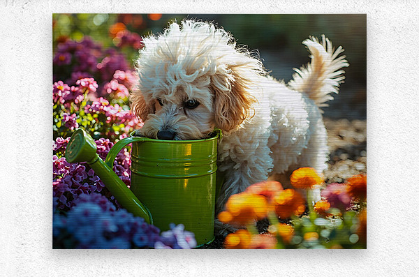 Get this artwork "Free Poodle Puppy Sits By Overturned Watering Can" in a framed print.
