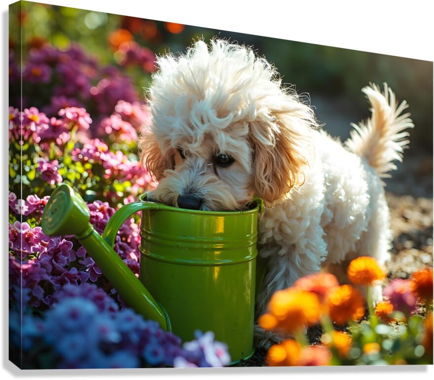 Free Poodle Puppy Sits By Overturned Watering Can Canvas print