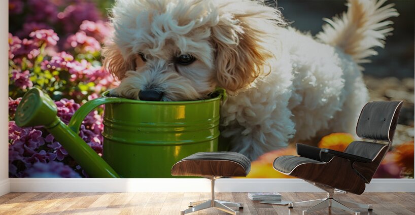The white poodle puppy sits contentedly beside the now-tipped watering can looking pleased with its adventure small water droplets glistening on its curly fur around the face area. Digital Artwork.