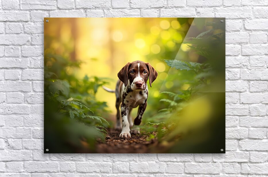 An energetic German Shorthaired Pointer puppy with distinctive brown and white spotted markings walks along a peaceful dirt trail through a lush forest his tail wagging with excitement as sunlight creates beautiful patterns through the canopy above Digital Artwork.