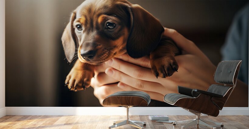 A young brown and black dachshund puppy sits in a clean white veterinary examination room looking around with curious but nervous eyes. The puppys small body and floppy ears show its young age as it takes in the unfamiliar clinical environment. Digital Artwork.