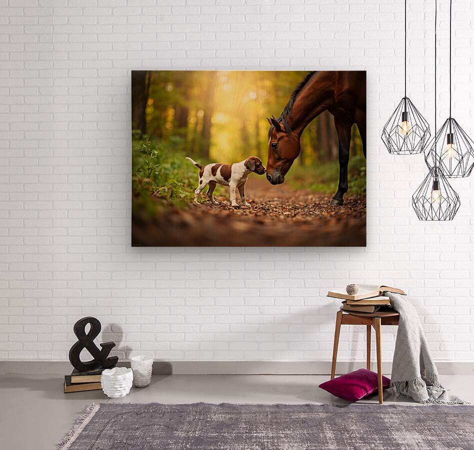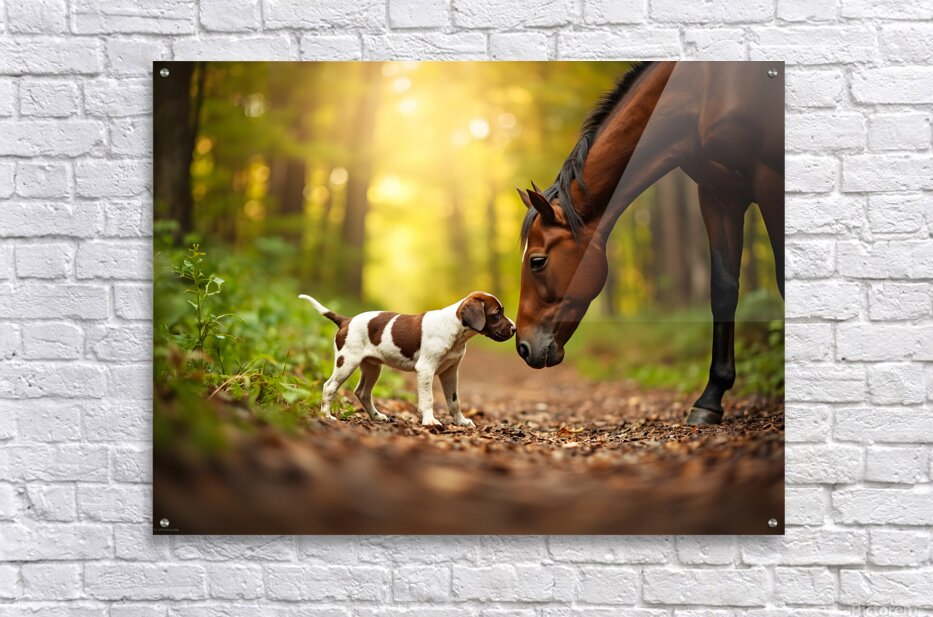 The German Shorthaired Pointer puppy with his characteristic brown and white spotted coat sits contentedly beside the horses sturdy legs both animals having formed a sweet friendship on the peaceful forest trail bathed in golden light Digital Artwork.