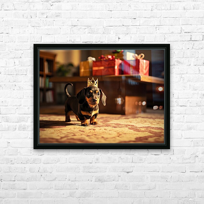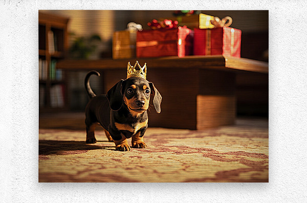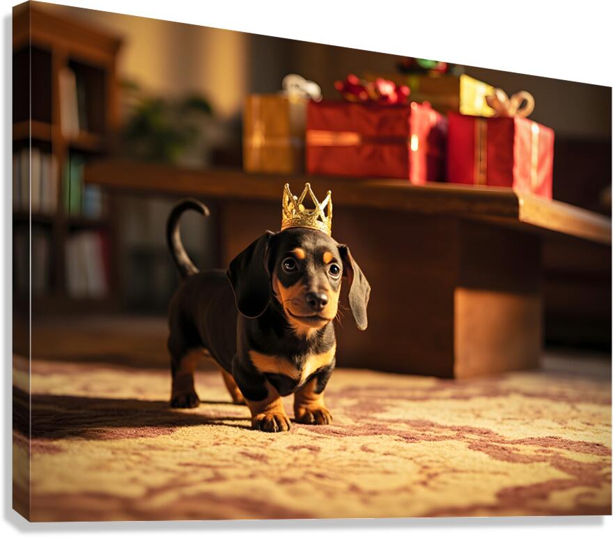 A cute brown and black dachshund puppy wearing a shimmering golden paper crown sits on polished wooden flooring. The puppys eyes sparkle with exciteme...[+]