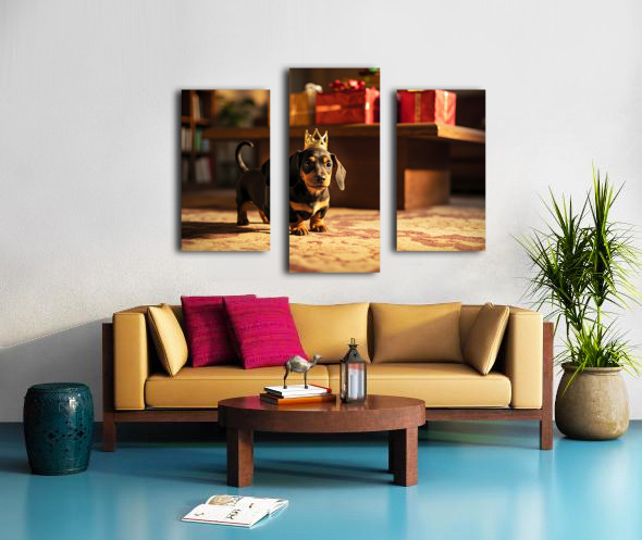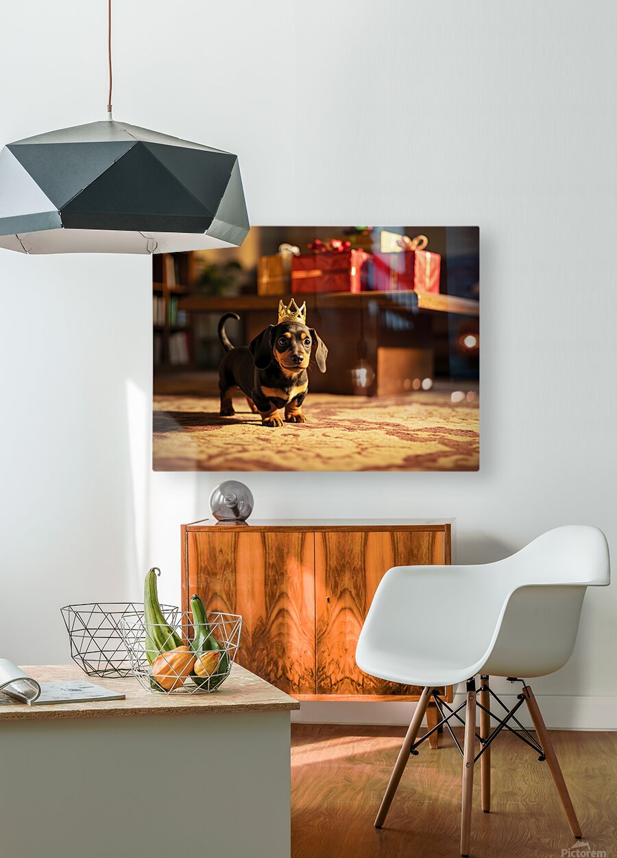 A cute brown and black dachshund puppy wearing a shimmering golden paper crown sits on polished wooden flooring. The puppys eyes sparkle with excitement and its pink tongue peeks out slightly. Colorful party streamers and balloons blur softly in the background. Digital Artwork.