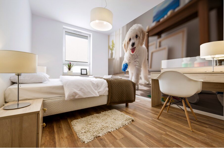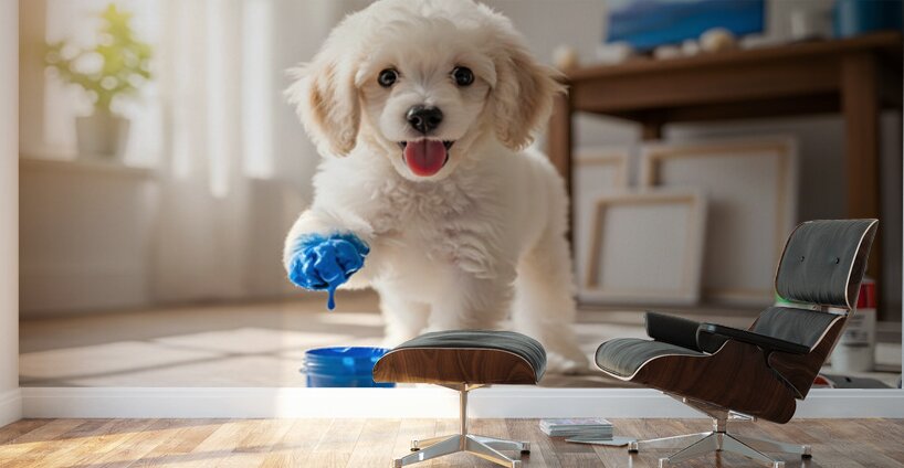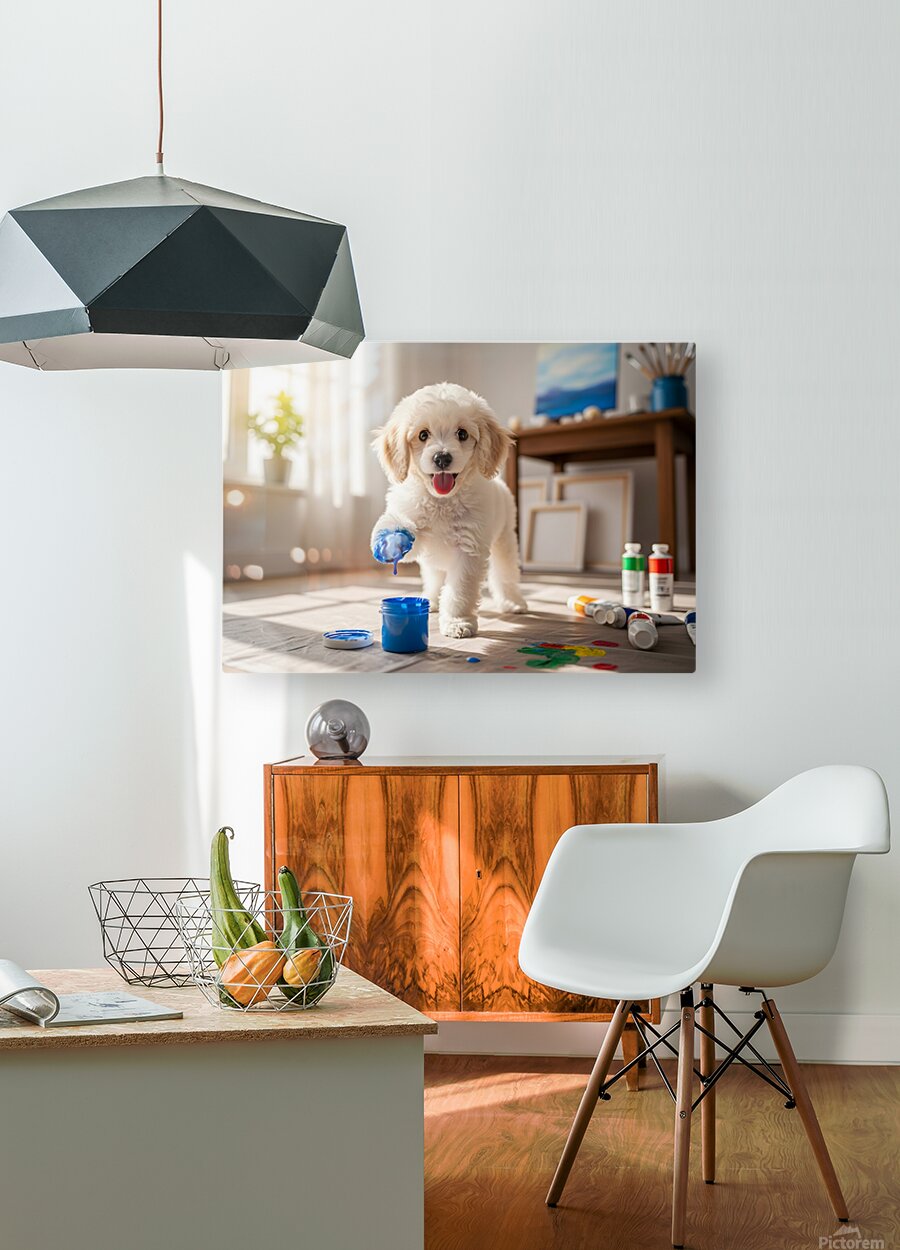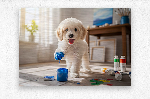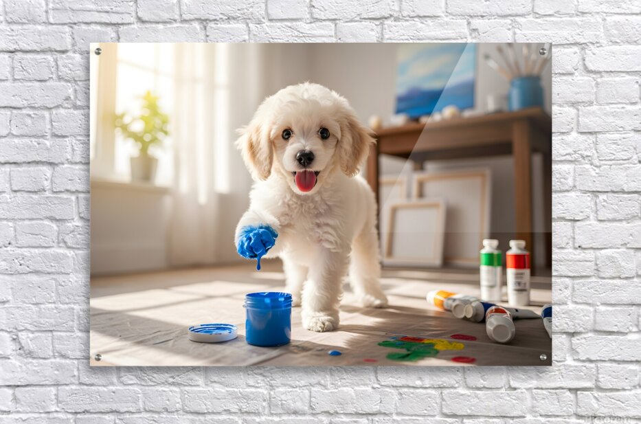 A adorable white poodle puppy sits beside open paint containers filled with vibrant red blue yellow and green paint. The curious puppy gazes at the colorful supplies in a bright art room setting. Digital Artwork.